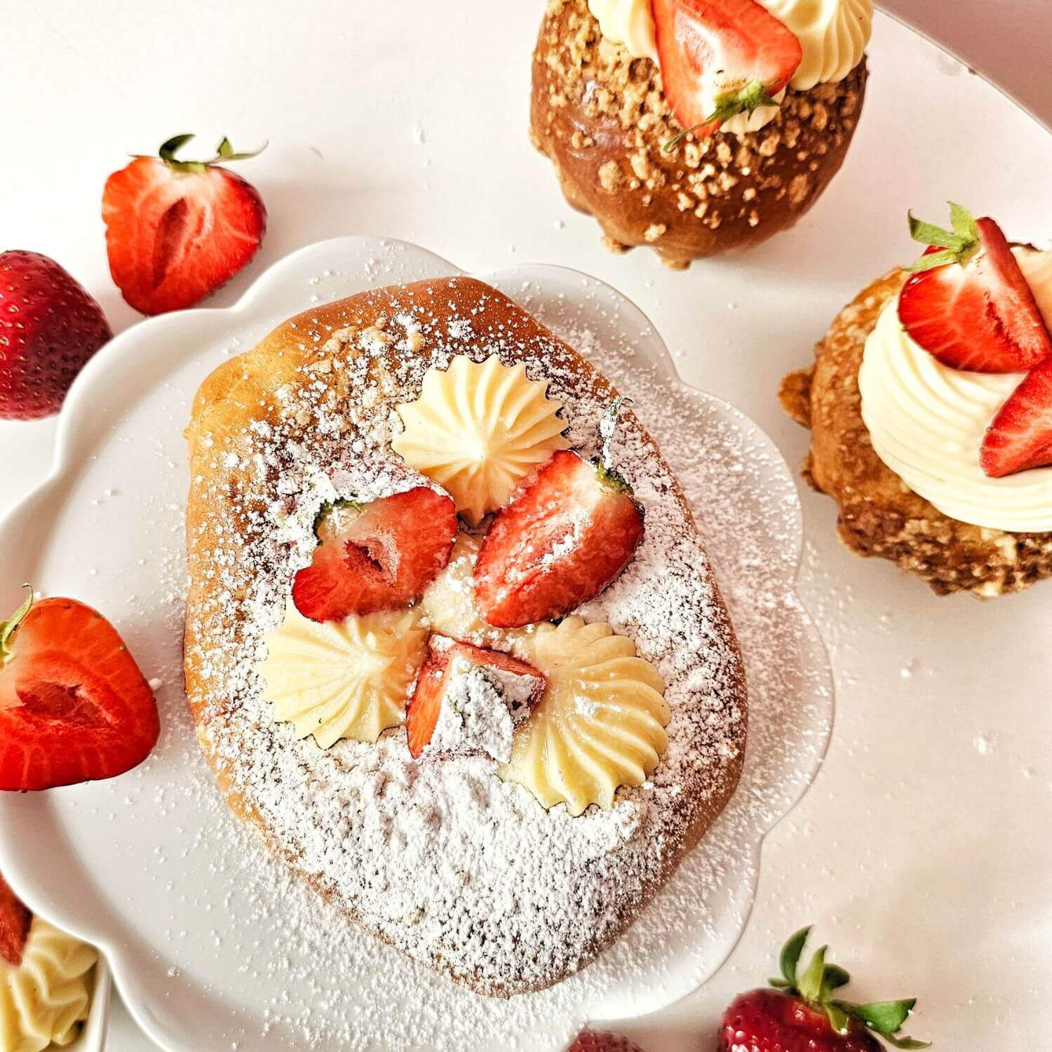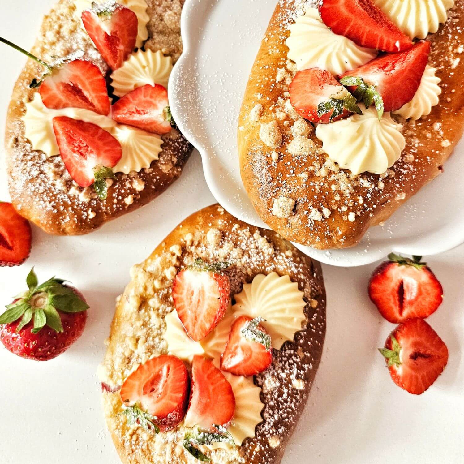 Poznaj naszą wyjątkową drożdżówkę z truskawkami! To mięciutkie, puszyste ciasto drożdżowe, które skrywa w sobie soczyste, aromatyczne truskawki, a każdy kęs to eksplozja smaku i domowego ciepła. Waga ok 250 – 270 g.