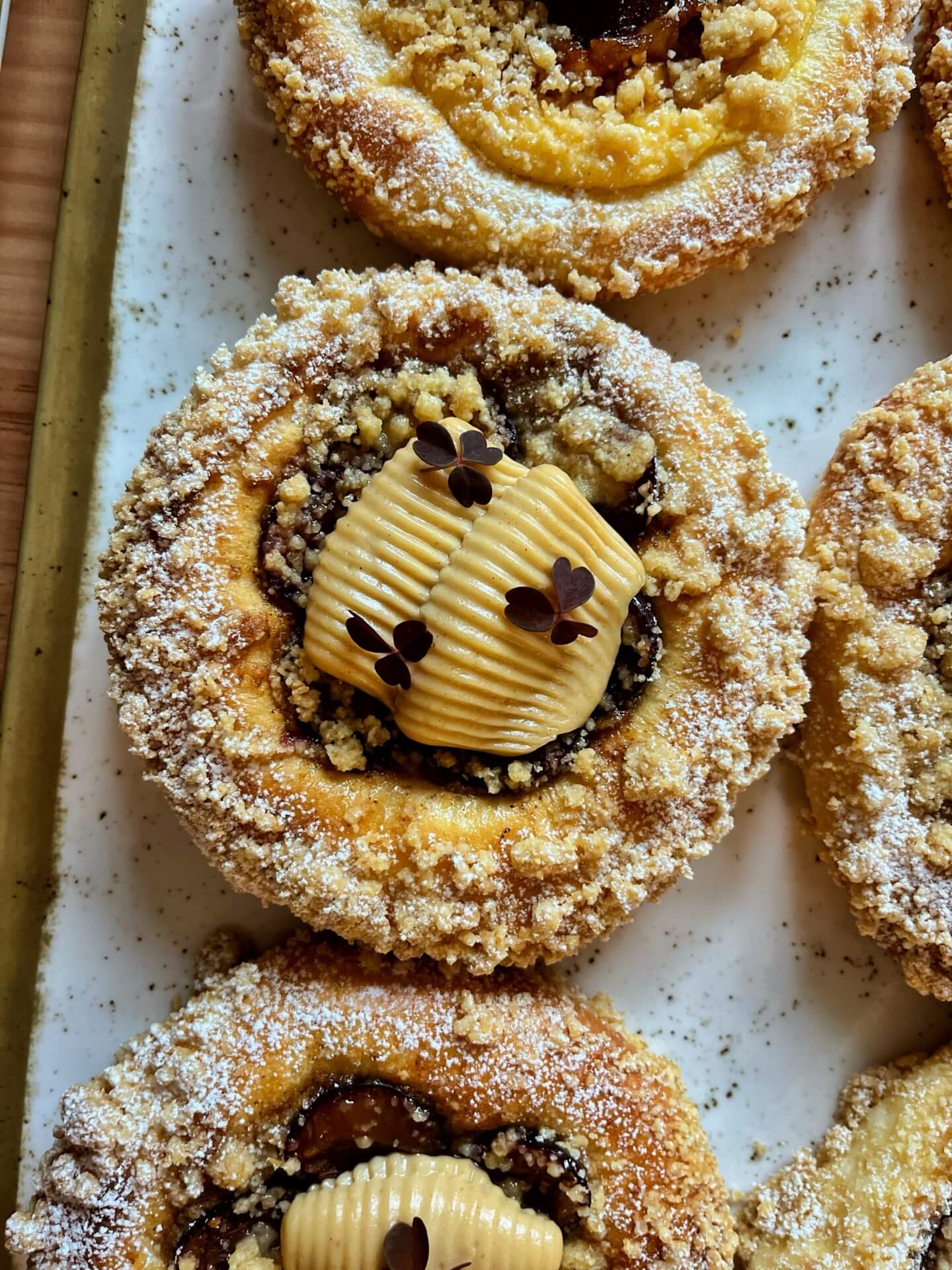 5. Czekoladowa drożdżówka z flanem kawowym, wiśniami, cremeux na mlecznej czekoladzie i kruszonką kawową